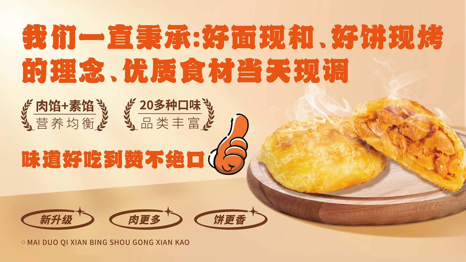今年我們河南麥多餡餅食品有限公司推出了新產(chǎn)品:“麥多奇鮮肉餅”。我們新出的麥多奇鮮肉餅采用整店明廚亮灶、一條條前腿肉掛在窗口處,一袋袋高筋面粉擺在案板上,店內(nèi)工作人員現(xiàn)場(chǎng)制作,純手工和面、調(diào)餡,一個(gè)餅使用一兩肉……